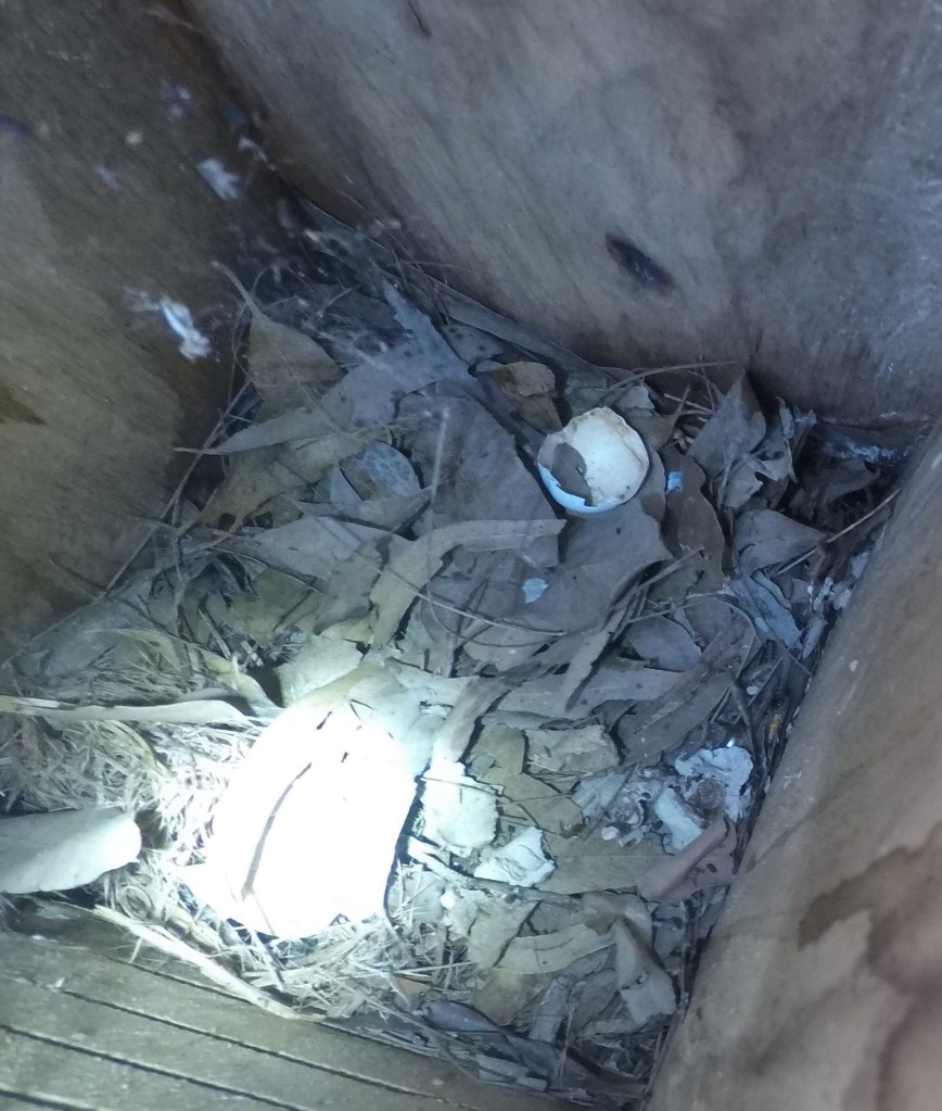 Spying in our next boxes Easter 2019, we came across an egg shell from an unknown critter. We think it might be from an owlet nightjar because it is the right size and we have seen them using our boxes in the past. Here’s hoping!